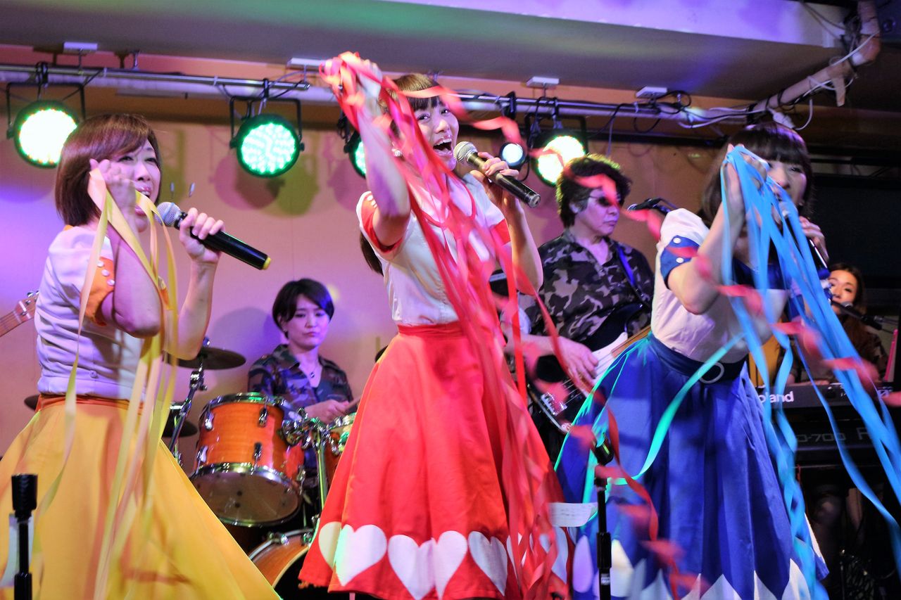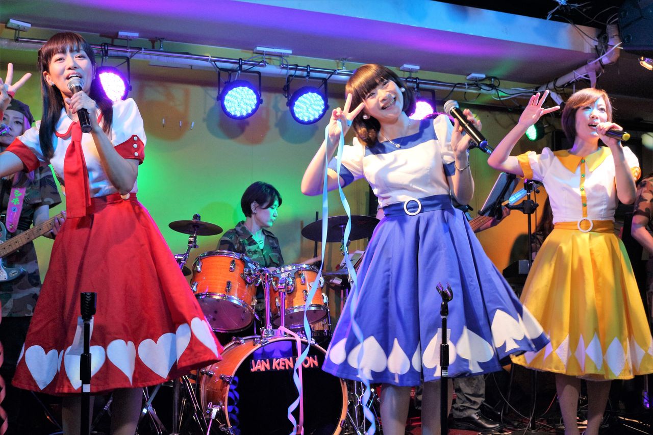 (スイートポップキャンディの3人が客席を見渡して)「・・・来てないけど、歌っちゃえ!」で始まった「微笑がえし」。噂をすればなんとやら。ハートのエースを召喚するスイキャンマジック!