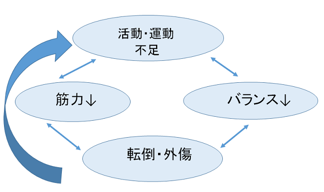 運動不足が筋力低下やバランス障害を招き、転倒・外傷を