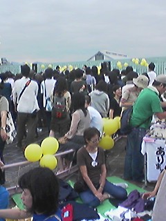 屋上では、100円入れたらガー動く5才児ぐらいまでが乗るのりもんや、ちっちゃいメリーゴランドや風船やらがあって、アダルトなチャイルドが群がっておりました。フリマなども催されており、ビール片手にふらついていた僕は、たいして欲しくもない缶バッヂを買ったりしてキセルの登場を待ちわびておりました。